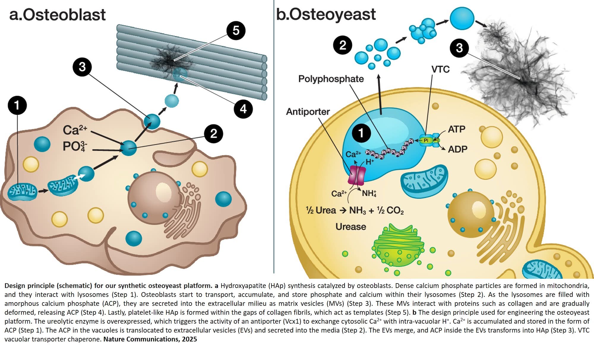In mammals, specialized cells called osteoblasts draw calcium phosphate from body fluids that is then processed and secreted as HAp. Osteoblasts are not suitable for large-scale industrial HAp production, according to the researchers, so they turned to osteoyeast, which uses enzymes to break down urea and increase the pH of the surrounding environment. This triggers tiny cavities in the yeast to accumulate calcium and phosphate that are then secreted and crystallized into HAp.