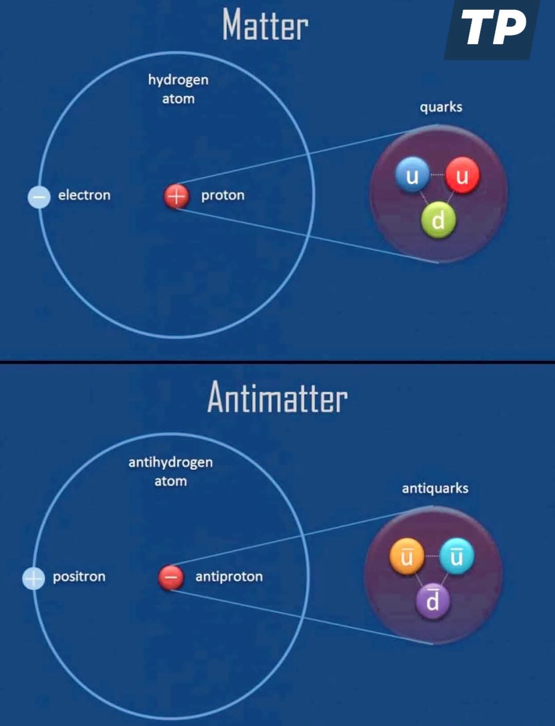 - 반양성자(Antiproton): 음전하를 띠는 입자로, 반업 쿼크(ū quark) 두 개와 반다운 쿼크(d̄ quark) 하나로 구성됩니다. 양성자와 질량은 같지만 전하가 반대입니다.