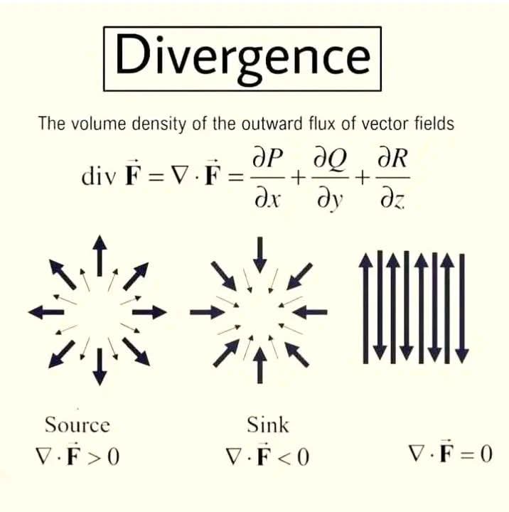 - 발산의 정의: 벡터장의 바깥쪽 플럭스의 부피 밀도.
