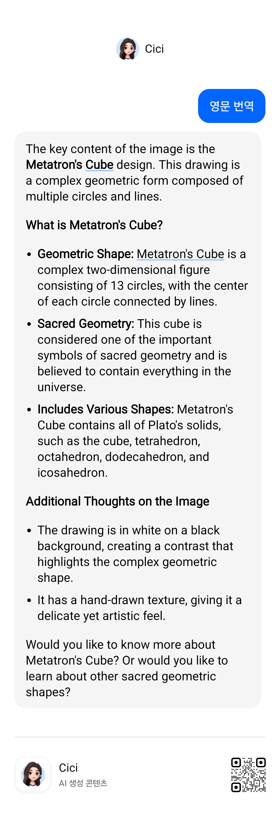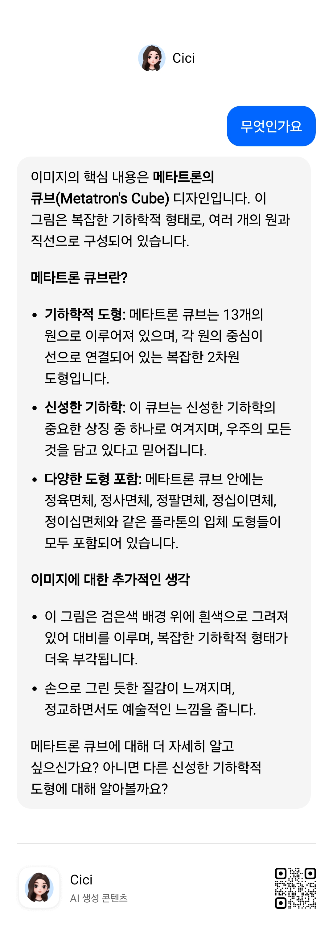 메타트론 큐브에 대해 더 자세히 알고 싶으신가요? 아니면 다른 신성한 기하학적 도형에 대해 알아볼까요?