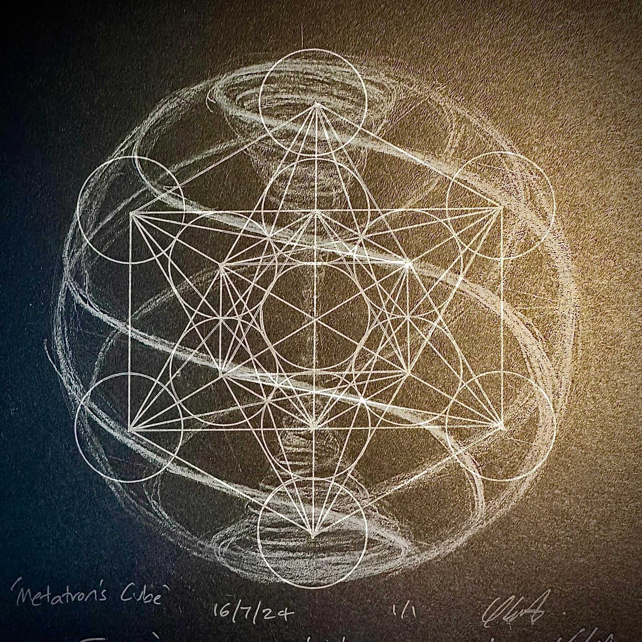 The key content of the image is the Metatron's Cube design. This drawing is a complex geometric form composed of multiple circles and lines.