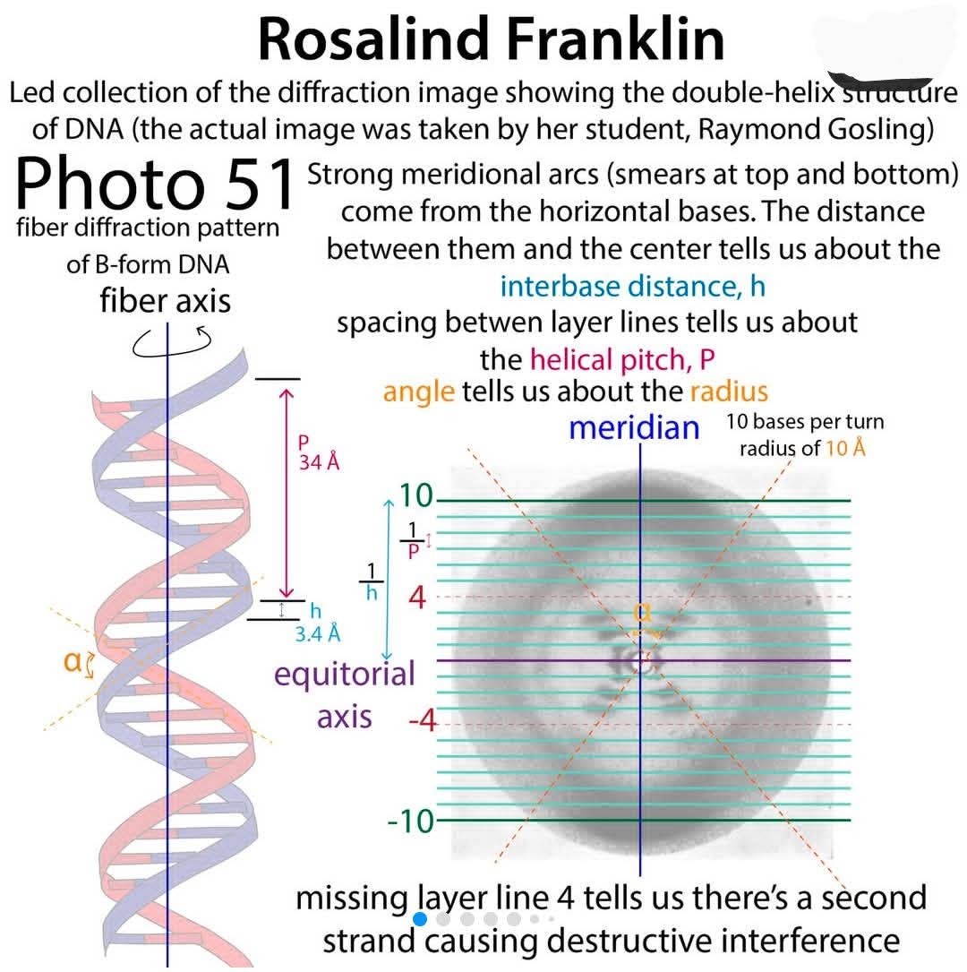 사진 51은 제임스 D. 왓슨과 프랜시스 크릭이 DNA의 이중 나선 구조를 확인하는 데 결정적인 증거가 되었습니다. 왓슨은 사진을 보자마자 "입이 떡 벌어지고 맥박이 뛰기 시작했다"고 회상했습니다. 크릭과 왓슨은 프랭클린의 데이터를 통해 DNA 구조를 밝혀냈으며, 이는 생물학 역사상 가장 중요한 발견 중 하나로 꼽힙니다 .