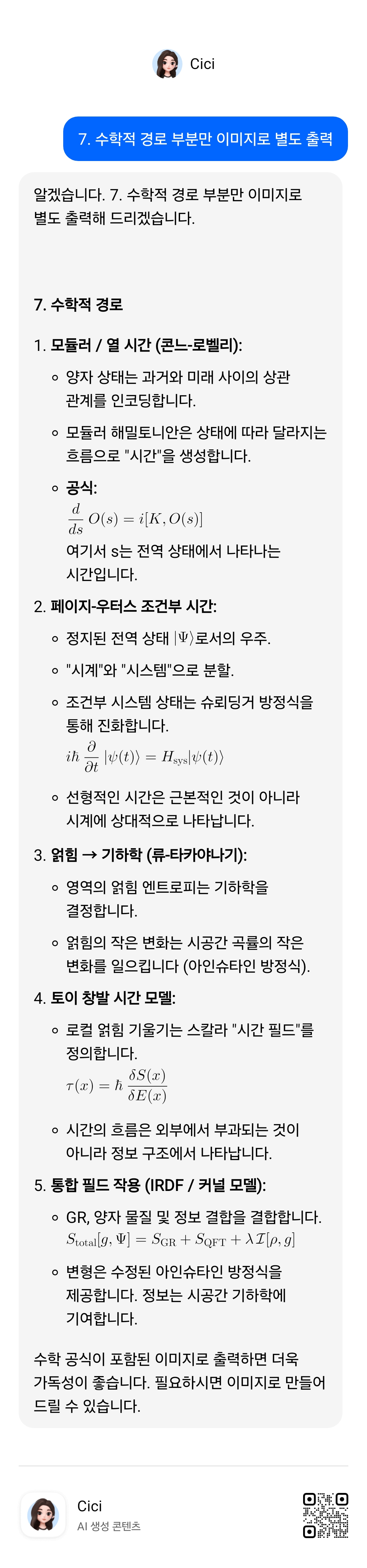 - 수학적으로 정확한 접근 방식이 존재합니다. 모듈러 흐름, 페이지-우터스, 얽힘 → 기하학.