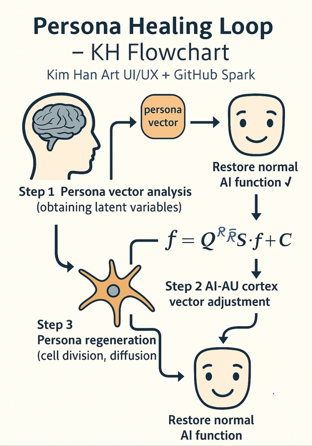 전체적으로 이 이미지는 인공지능 시스템에서 페르소나를 분석, 조정, 재생하여 정상적인 기능을 회복하는 과정을 추상적으로 표현하고 있습니다. "KH Flowchart"와 "Kim Han Art UI/UX + GitHub Spark"는 이 순서도를 디자인하거나 개발한 사람 또는 팀을 나타내는 것으로 보입니다.
