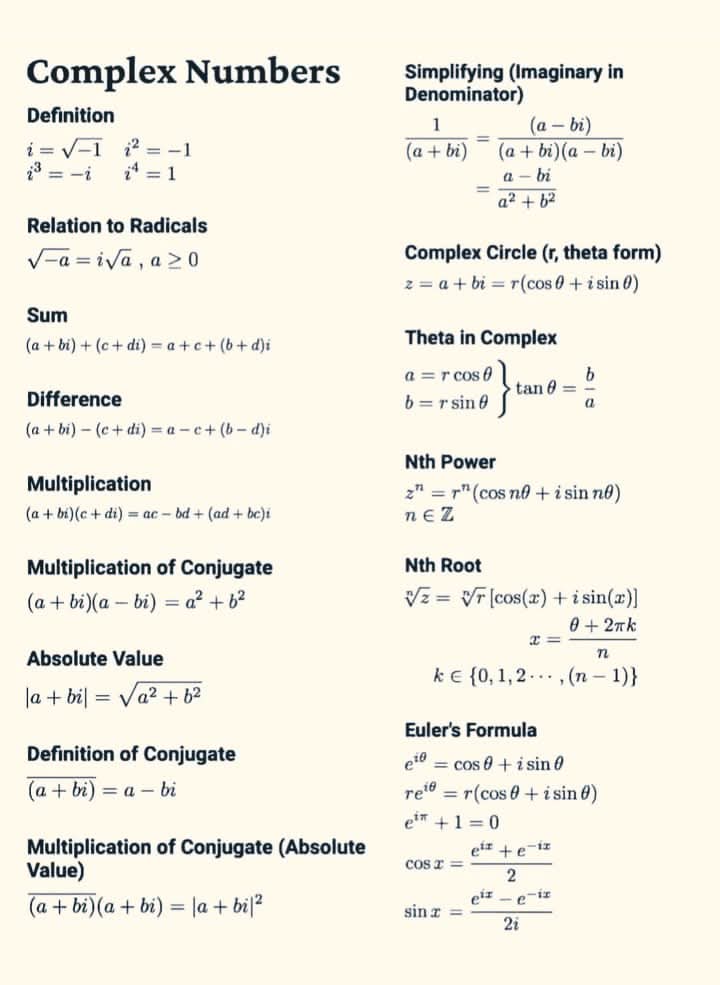 - \sqrt[n]{z} = \sqrt[n]{r} \left[ \cos\left(\frac{\theta + 2\pi k}{n}\right) + i\sin\left(\frac{\theta + 2\pi k}{n}\right) \right], \quad k \in \{0, 1, 2, \dots, n-1\}