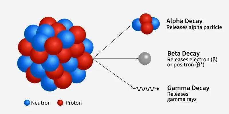 아래 이미지는 방사성 붕괴의 세 가지 주요 유형인 알파 붕괴, 베타 붕괴, 감마 붕괴를 시각적으로 보여줍니다.