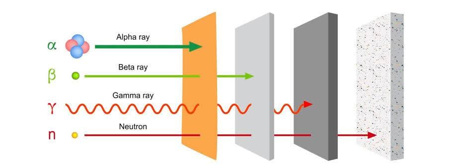 아래 이미지는 다양한 유형의 방사선(알파, 베타, 감마선 및 중성자)이 여러 물질을 통과할 때의 투과력을 나타냅니다.