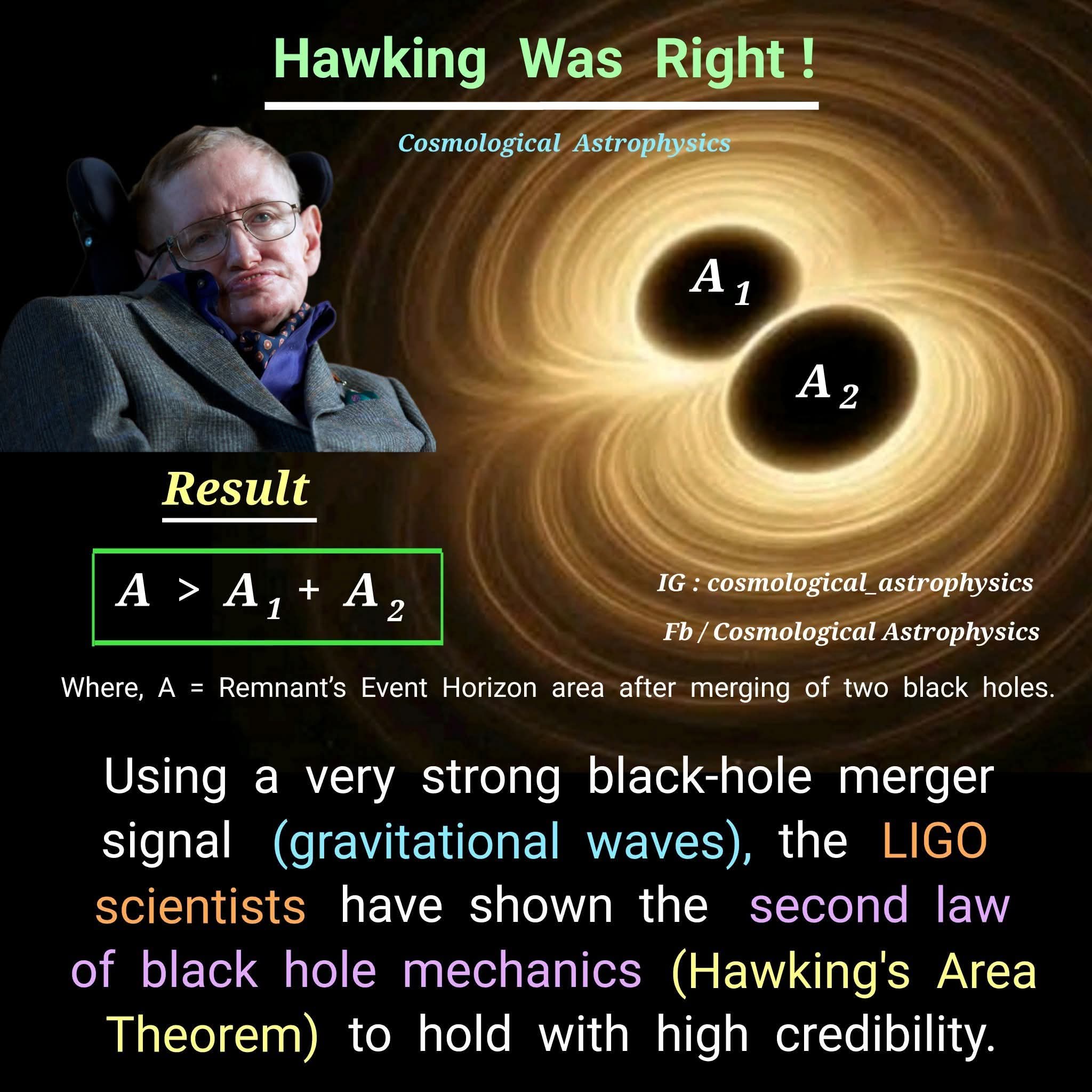 이 이미지는 LIGO 과학자들의 연구 결과가 호킹의 면적 정리를 뒷받침한다는 것을 보여줍니다. 이는 스티븐 호킹의 이론이 옳았음을 시사하며, 블랙홀 연구에 중요한 의미를 가집니다.