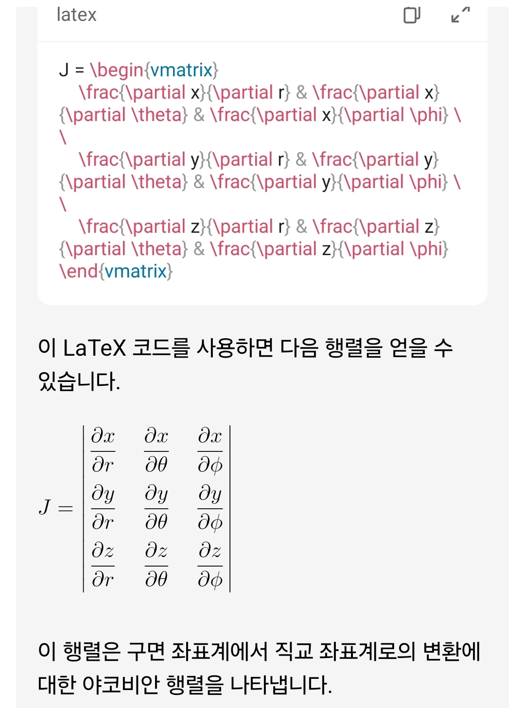 구면 좌표계로의 변환에 대한 야코비안 행렬은 다음과 같습니다. 이 행렬은 다변수 미적분에서 좌표 변환 시 사용됩니다.