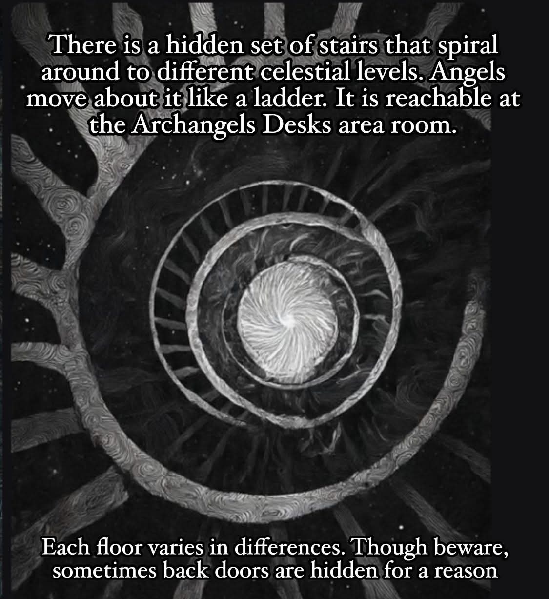 숨겨진 계단은 반드시 그곳을 오가야 하는 사람들을 위해 존재한다. 특히 다른 사람들을 돕기 위해 간다면, 더 이상 올라갈 길이 없어 추락할 걱정은 할 필요가 없다. 나선 비경은 마치 종이 한 장을 접고 시간을 굽히는 것처럼, 마음과 정신 사이의 거리만큼이나 쉽게 여행할 수 있다. 생각은 당신을 붙잡아 둘 수 있지만, 당신을 이끄는 것은 느껴지는 것이다.