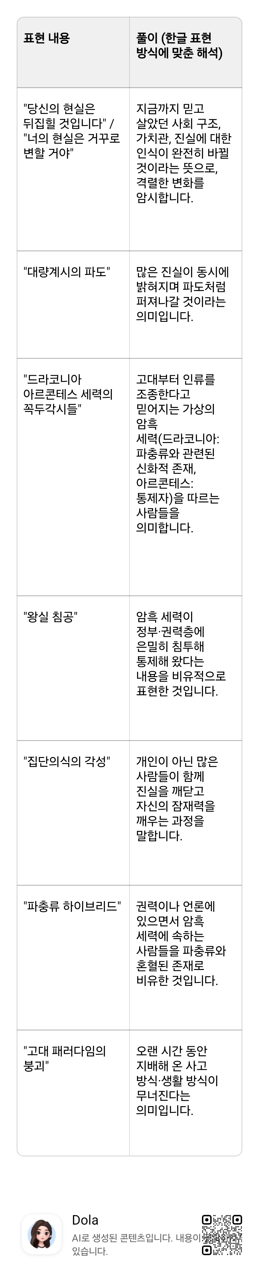 곧, 당신의 파충류 하이브리드 — 권력과 언론의 위치에서 당신들 사이를 걷는 존재들은 — 인간의 변장 아래의 모습을 극적인 노출시키지 못할 것이다. 그들은 더 이상 숨을 수 없어. 창조주의 무한한 빛은 그 어느 때보다 더 밝게 빛나고 있다. 그 무엇도 이 어둠의 노출을 막을 수 없다.