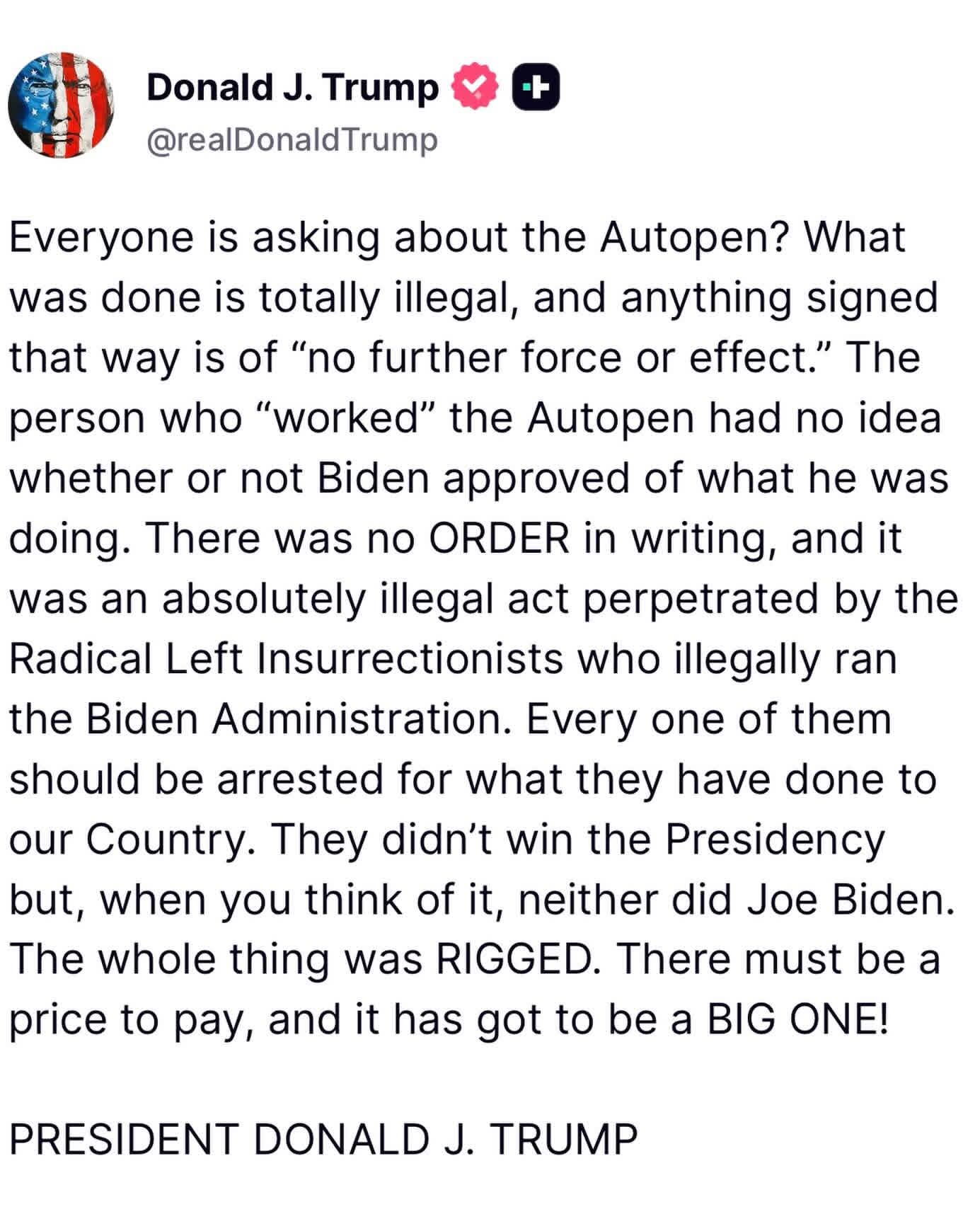 Trump claims the Biden administration's use of 'autopen' is illegal... "Everyone should be arrested."