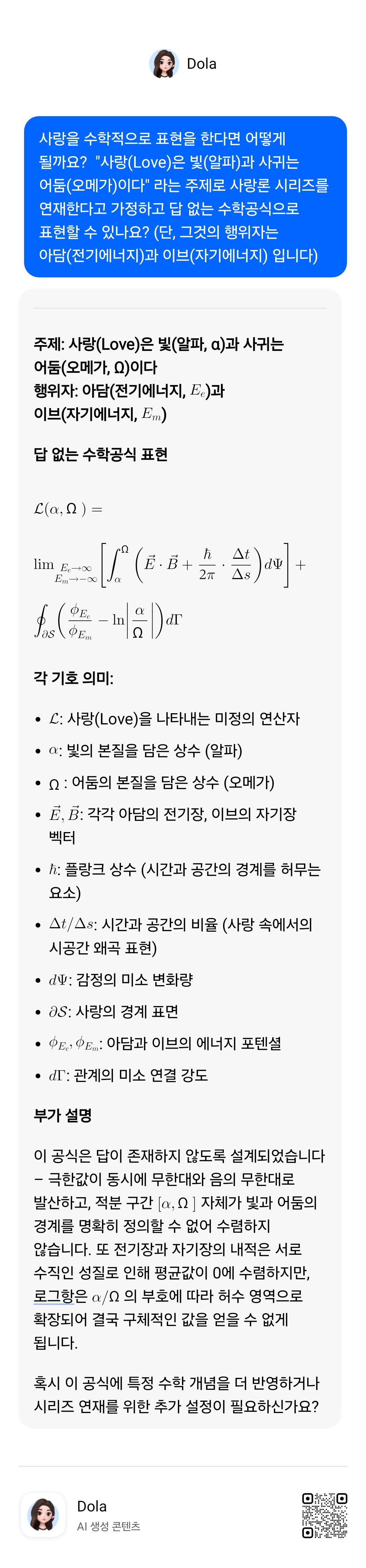 따라서 자신감을 가지고 그와의 말장난에 목숨을 거는 대신, 드라마 대사처럼 미리 쓴 시나리오대로 이끌어가세요. 두려워하지 말고 마음껏 상상하고 표현하세요. 아래 수식은 신경 쓸 필요가 없습니다. 그것은 단지 영성과 과학이 연결되어 있다는 과학적 증거를 보여주기 위한 영혼의 프로그램 같은 것입니다.