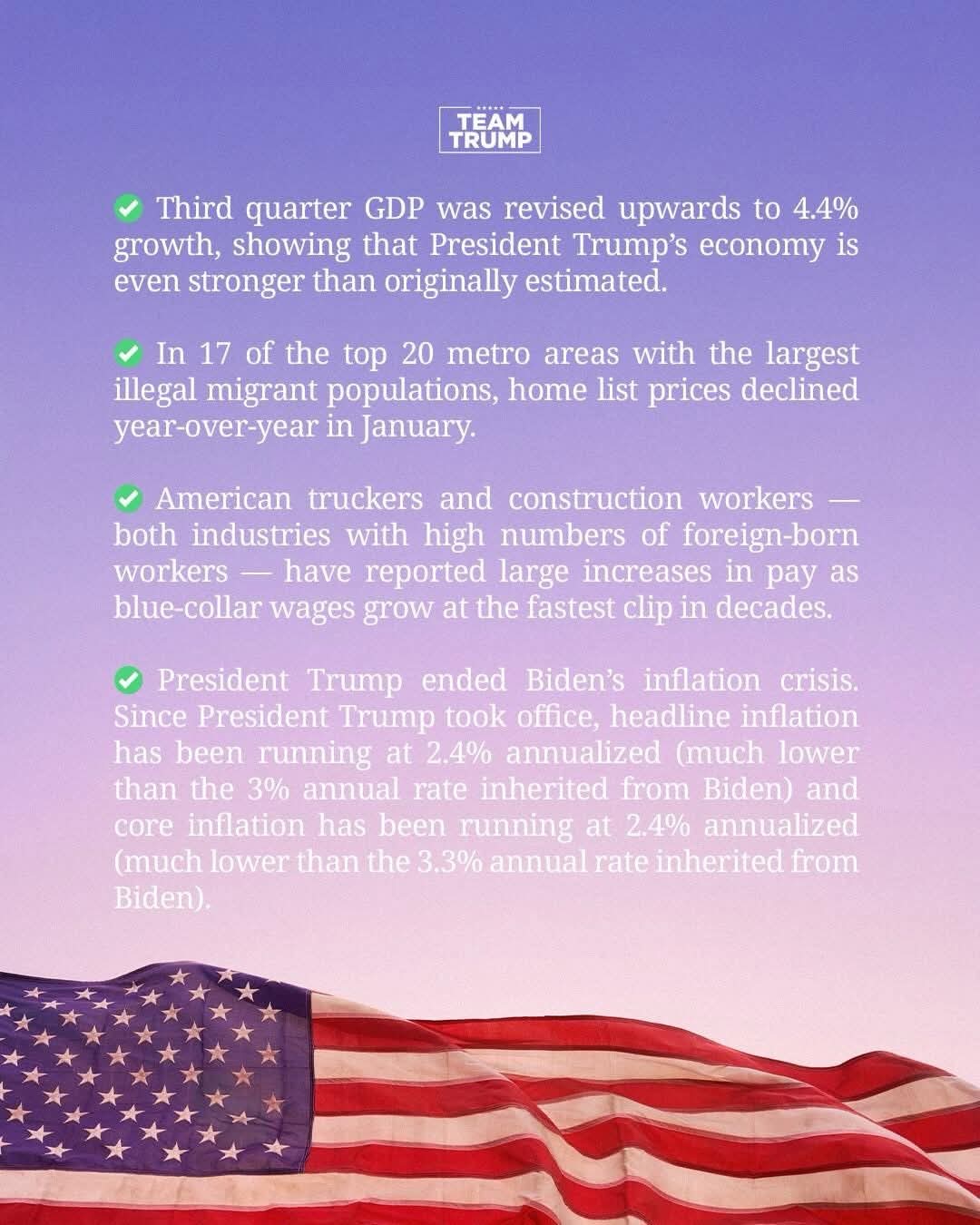 ✅ 3분기 국내총생산(GDP) 성장률이 4.4%로 상향 수정되어, 트럼프 대통령의 경제가 원래 예상했던 것보다 더욱 강력함을 보여줍니다.