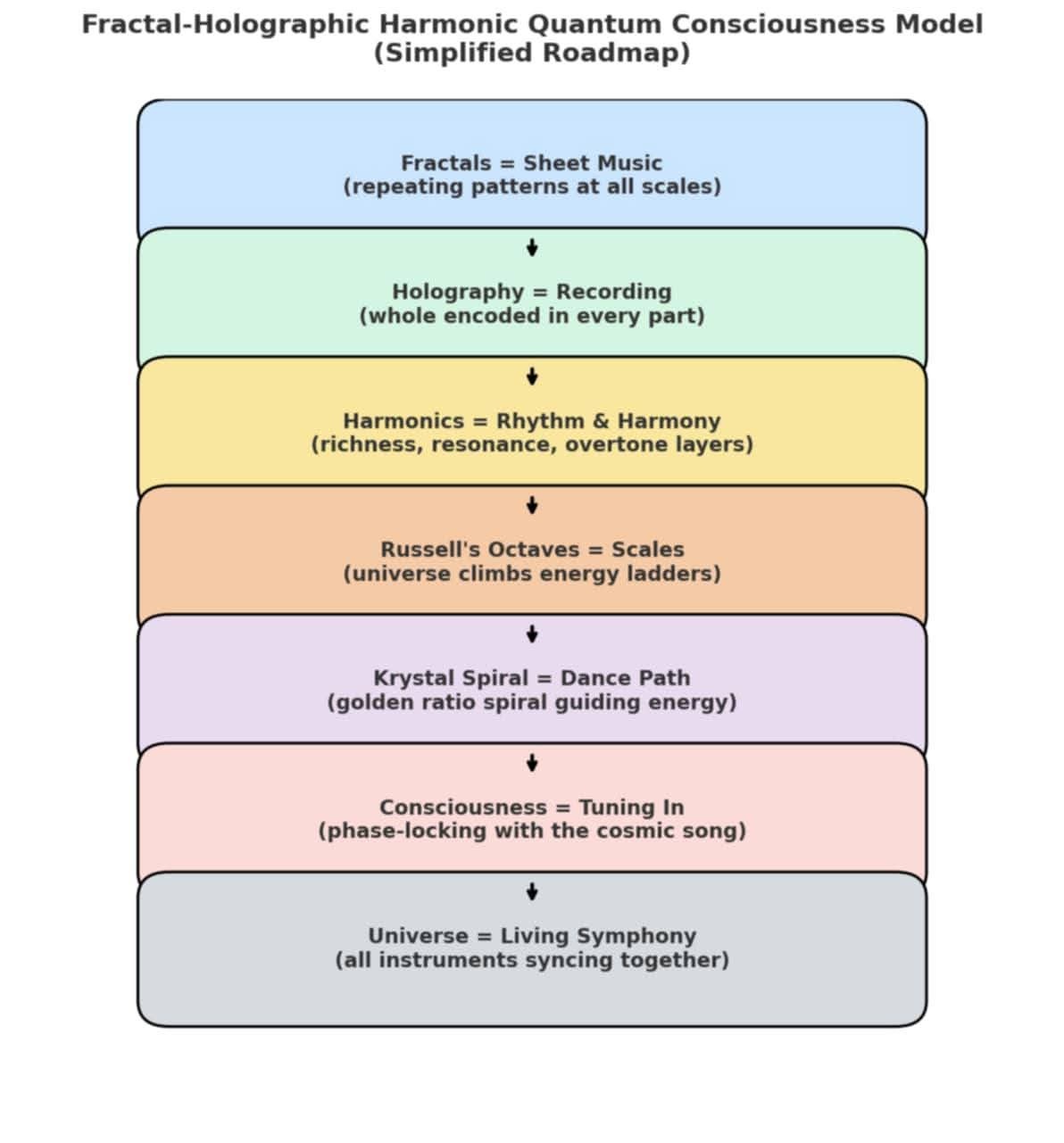 This artwork visualizes a simplified roadmap of the "Fractal-Holographic Harmonic Quantum Consciousness Model," which explains the structure of the universe and consciousness using musical metaphors. Each layer corresponds to a musical element, showing how the entire universe operates as a living symphony.