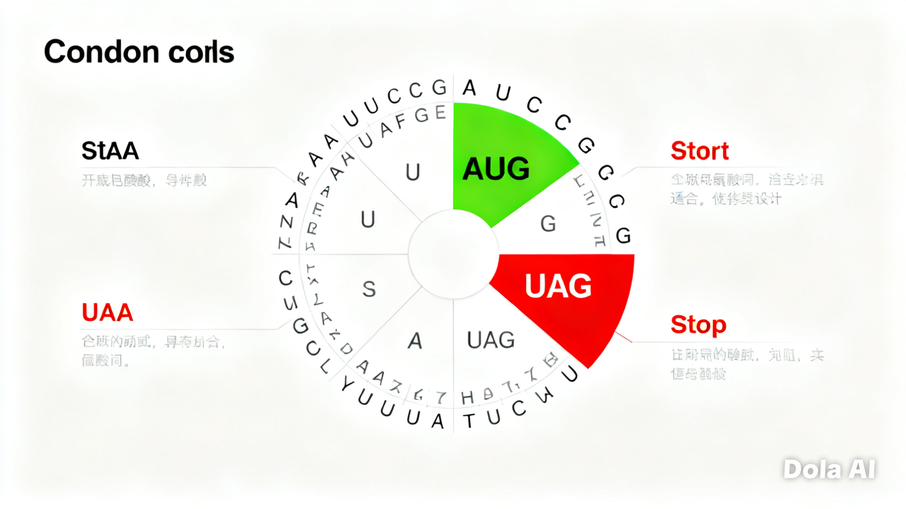 예를 들어 UUU는 페닐알라닌이라는 아미노산을 부르고, UAA는 "여기까지! 단백질 완성!"이라고 외치는 종결 코돈이에요.