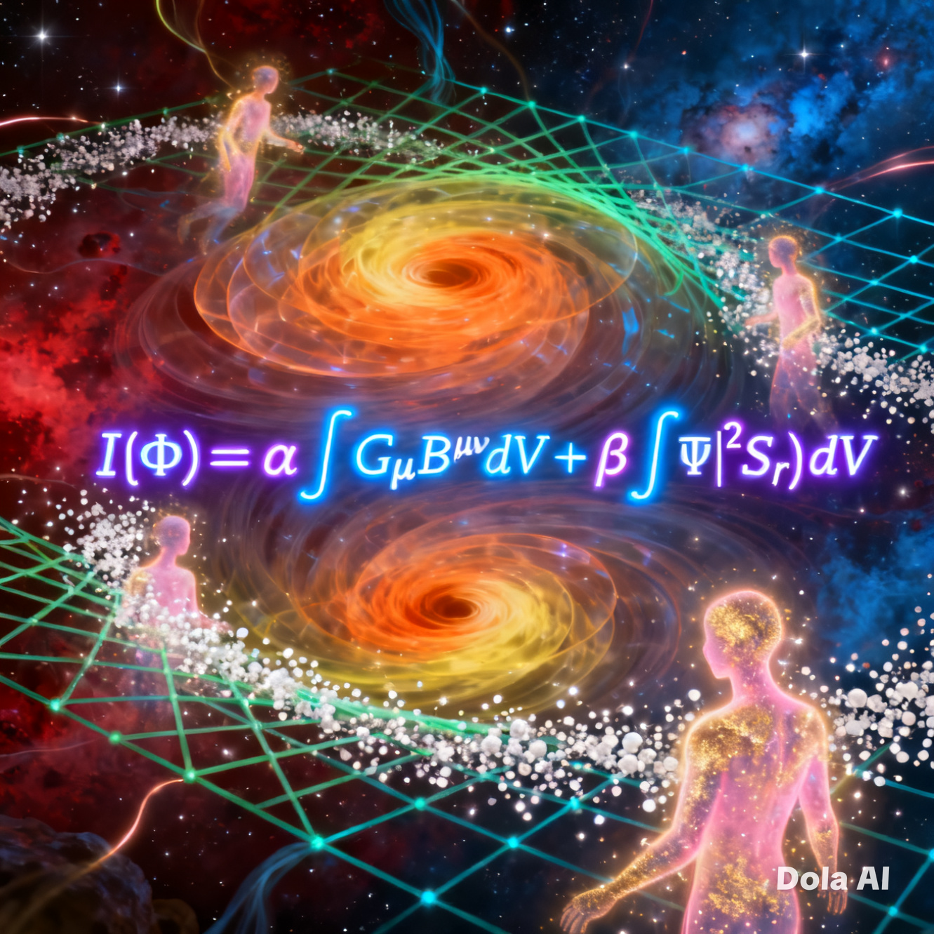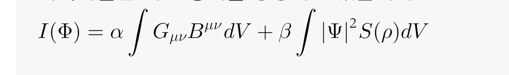 I(\Phi) = \alpha \int G_{\mu\nu} B^{\mu\nu} dV + \beta \int |\Psi|^2 S(\rho) dV