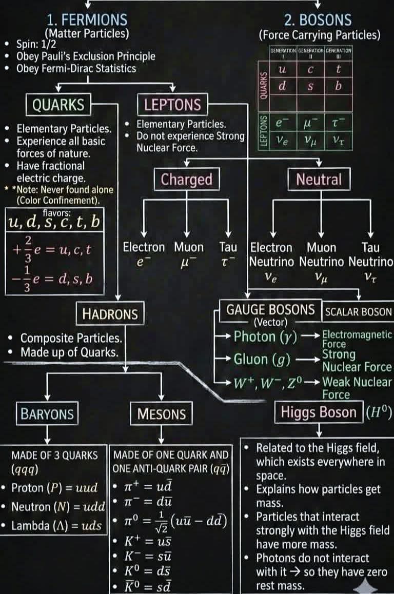 - 메손: 쿼크와 안티쿼크 한 쌍으로 이뤄져요. 예를 들어 양전하 파이온(π⁺)은 u와 안티d로 만들어져요.