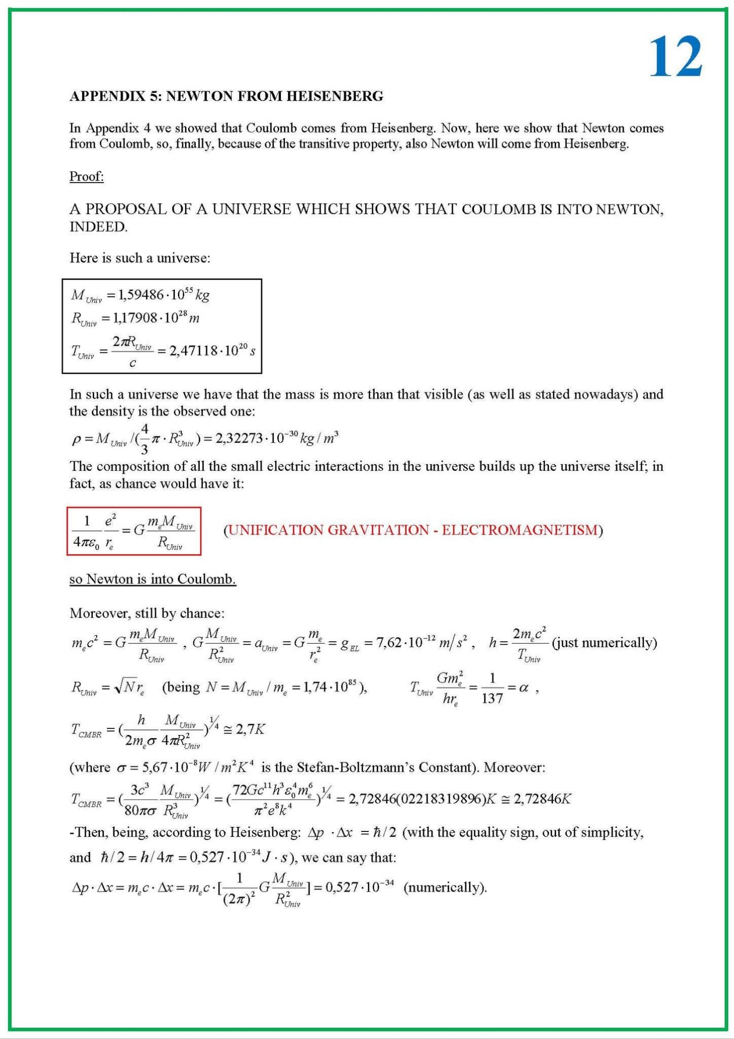 5. 따라서 전체 우주는 하이젠베르크 불확정성 원리에 따라 재소멸에 의해 사라져야 하는 입자-반입자 쌍의 대규모 생성에서 비롯되며, 명백한 상호 재인력(에너지 보존 원칙을 위반하지 않기 위해)과 그러한 재인력은 (기본적인) 쿨롱 힘(부록 4 참조)의 존재를 결정하고 이러한 모든 나타나고 사라지는 쌍 중에서 중력의 관점에서 모든 물질의 전반적인 상호 재인력을 결정합니다(부록 5 참조).