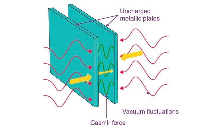 공간은 모든 파장에서 전자기적 변동으로 가득 차 있으며, 카시미르 장치는 전도성 판 두 개로 구성되어 판의 존재가 진공의 영점 에너지를 변경합니다. 경계 조건은 반정수 파장에서만 변동이 존재하도록 허용합니다. 이러한 제약은 판 사이의 공동 내 에너지 밀도를 외부 에너지 밀도에 비해 낮추고 판 사이에 인력 상호 작용을 일으켜 판을 서로 끌어당기는 순수한 힘을 생성합니다.