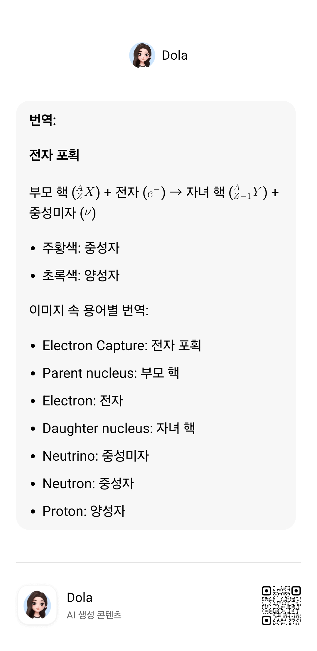 전자 포획 후 핵 주변 궤도에 빈 자리가 생기면, 높은 에너지 궤도(L층)의 전자가 낮은 에너지 궤도(K층)로 이동하며 차이나는 에너지를 엑스선(X-ray) 형태로 방출합니다. 핵 내부에서는 양성자가 중성자로 변환되며 중성미자(neutrino)가 함께 나옵니다.