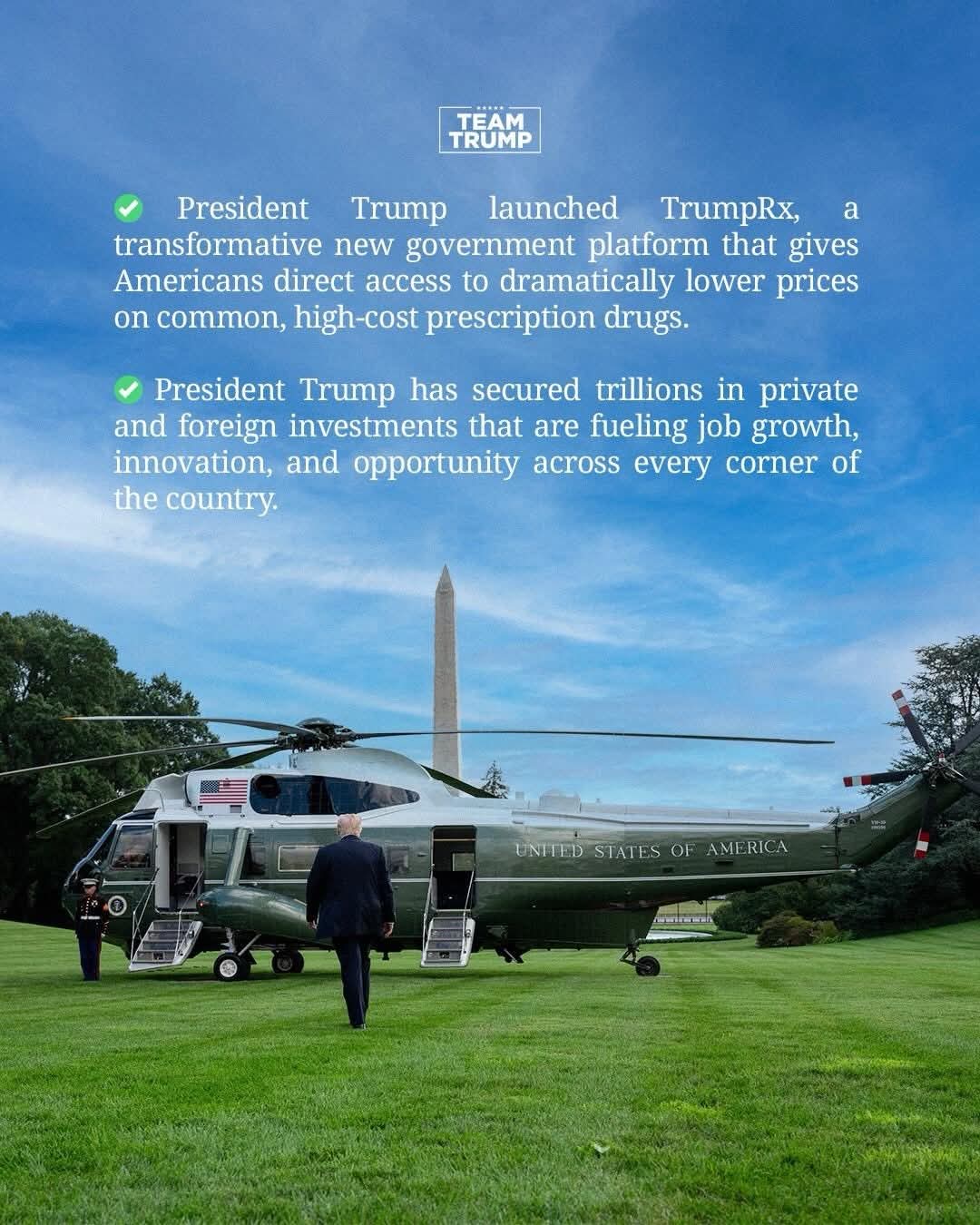 ✅ 트럼프 대통령은 보편적이면서 고비용의 처방약 가격을 획기적으로 낮춰 미국 국민들이 직접 이용할 수 있게 하는 혁신적인 새로운 정부 플랫폼인 '트럼프Rx(TrumpRx)'를 출시했습니다.